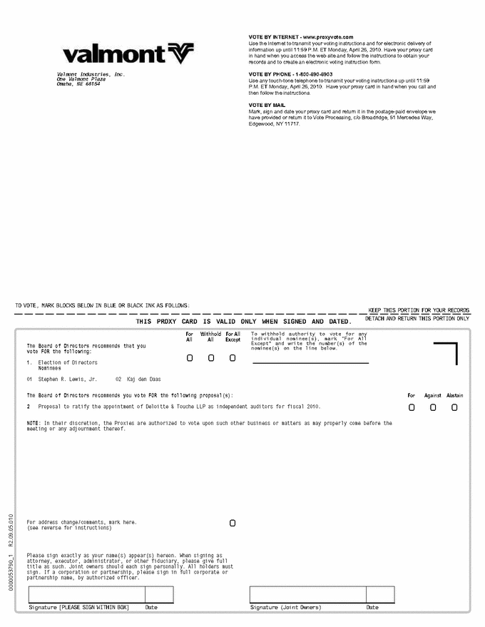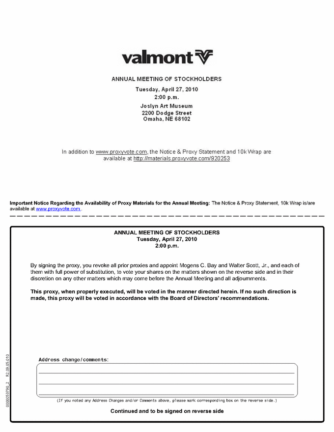 valmont ANNUAL MEETING OF STOCKHOLDERS Tuesday, April 27, 2010 2:00 p.m. Joslyn Art Museum 2200 Dodge Street Omaha, NE 68102 In addition to www.proxyvote.com, the Notice & Proxy Statement and 10k Wrap are available at http://materials .proxyvote .com/9 20253 Important Notice Regarding the Availability of Proxy Materials for the Annual Meeting: The Notice & Proxy Statement, 10k Wrap is/are available at www.proxyvote.com. ANNUAL MEETING OF STOCKHOLDERS Tuesday, April 27, 2010 2:00 p.m. By signing the proxy, you revoke all prior proxies and appoint Mogens C. Bay and Walter Scott, Jr., and each of them with full power of substitution, to vote your shares on the matters shown on the reverse side and in their discretion on any other matters which may come before the Annual Meeting and all adjournments. This proxy, when properly executed, will be voted in the manner directed herein. If no such direction is made, this proxy will be voted in accordance with the Board of Directors' recommendations.