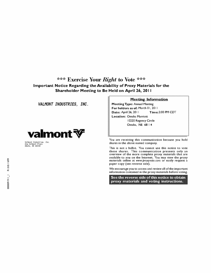 See the reverse side of this notice to obtain proxy materials and voting instructions. *** Exercise Your Right to Vote *** Important Notice Regarding the Availability of Proxy Materials for the Shareholder Meeting to Be Held on. You are receiving this communication because you hold shares in the above named company. This is not a ballot. You cannot use this notice to vote these shares. This communication presents only an overview of the more complete proxy materials that are available to you on the Internet. You may view the proxy materials online at www.proxyvote.com or easily request a paper copy (see reverse side). We encourage you to access and review all of the important information contained in the proxy materials before voting. Meeting Information Meeting Type: For holders as of: Date: Time: Location: 0000091911_1 R1.0.0.11699 VALMONT INDUSTRIES, INC. Valmont Industries, Inc. One Valmont Plaza Omaha, NE 68154 Annual Meeting March 01, 2011 April 26, 2011 April 26, 2011 2:00 PM CDT Omaha Marriott 10220 Regency Circle Omaha, NE 68114 |