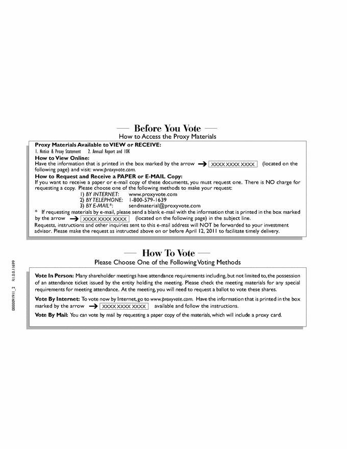 Please Choose One of the Following Voting Methods Vote In Person: Many shareholder meetings have attendance requirements including, but not limited to, the possession of an attendance ticket issued by the entity holding the meeting. Please check the meeting materials for any special requirements for meeting attendance. At the meeting, you will need to request a ballot to vote these shares. Vote By Internet: To vote now by Internet, go to www.proxyvote.com. Have the information that is printed in the box marked by the arrow available and follow the instructions. Vote By Mail: You can vote by mail by requesting a paper copy of the materials, which will include a proxy card. How To Vote XXXX XXXX XXXX Before You Vote How to Access the Proxy Materials Proxy Materials Available to VIEW or RECEIVE: How to View Online: Have the information that is printed in the box marked by the arrow (located on the following page) and visit: www.proxyvote.com. How to Request and Receive a PAPER or E-MAIL Copy: If you want to receive a paper or e-mail copy of these documents, you must request one. There is NO charge for requesting a copy. Please choose one of the following methods to make your request: 1) BY INTERNET: www.proxyvote.com 2) BY TELEPHONE: 1-800-579-1639 3) BY E-MAIL*: sendmaterial@proxyvote.com * If requesting materials by e-mail, please send a blank e-mail with the information that is printed in the box marked by the arrow (located on the following page) in the subject line. XXXX XXXX XXXX XXXX XXXX XXXX 0000091911_2 R1.0.0.11699 1. Notice & Proxy Statement 2. Annual Report and 10K Requests, instructions and other inquiries sent to this e-mail address will NOT be forwarded to your investment advisor. Please make the request as instructed above on or before April 12, 2011 to facilitate timely delivery. |