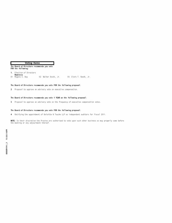 Voting items 0000091911_3 R1.0.0.11699 The Board of Directors recommends you vote FOR the following: 1. Election of Directors Nominees 01 Mogens C. Bay 02 Walter Scott, Jr. 03 Clark T. Randt, Jr. The Board of Directors recommends you vote FOR the following proposal: 2 Proposal to approve an advisory vote on executive compensation. The Board of Directors recommends you vote 1 YEAR on the following proposal: 3 Proposal to approve an advisory vote on the frequency of executive compensation votes. The Board of Directors recommends you vote FOR the following proposal: 4 Ratifying the appointment of Deloitte & Touche LLP as independent auditors for fiscal 2011. NOTE: In their discretion the Proxies are authorized to vote upon such other business as may properly come before the meeting or any adjournment thereof. |